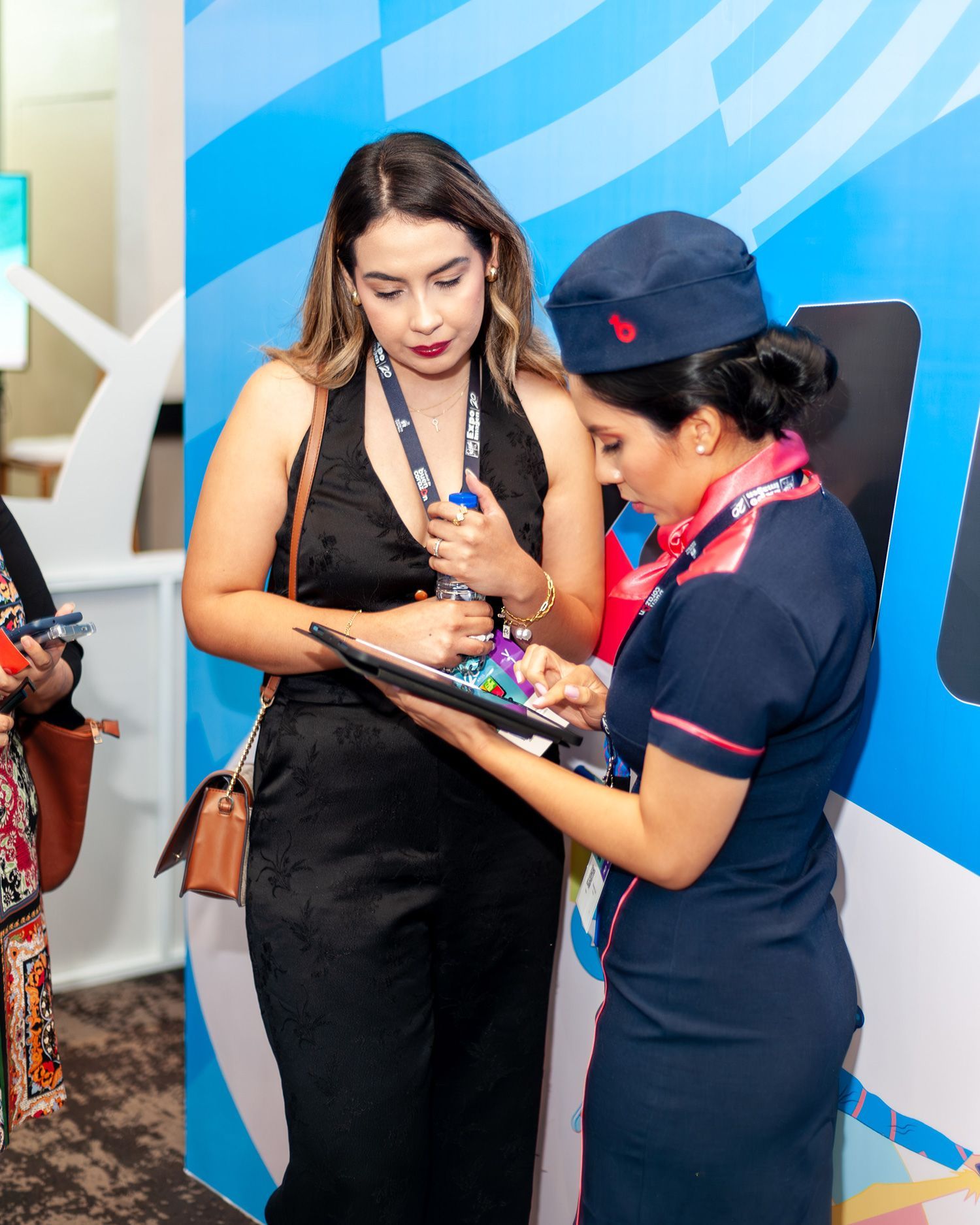 El stand de Oneblis fue una invitación a volar hacia nuevas experiencias. Diseñado para simular un vuelo, el espacio no solo capturó la atención de los visitantes, sino que también les permitió vivir la experiencia de primera clase que ofrece nuestra agencia. Este concepto creativo fue el resultado de un proceso de planificación y colaboración entre nuestro equipo.
